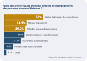 ● 73 % considèrent que la principale difficulté réside dans la gestion des troubles du comportement, l’aspect souvent le plus déstabilisant de la maladie.