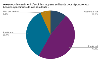 À la question « Avez-vous le sentiment d’avoir les moyens suffisants pour répondre aux besoins des résidents ? », plus de la moitié des professionnels (58,1 %) ont répondu par l’affirmative. Cette confiance en leurs capacités est un signe fort de l’engagement du secteur. Les 41,9 % restants rappellent toutefois que le secteur doit encore progresser pour renforcer ses ressources, tout en soulignant la volonté des équipes d’améliorer sans cesse la qualité des soins.